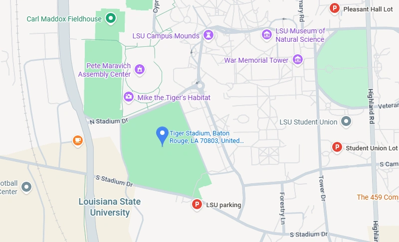 - » Free parking at Old Front Nine, Levee Lot South, Hayfield Lot, South Gourrier Lot, and Golf Course Areas and is indicated with the color purple on the official parking map on LSU Sports website.